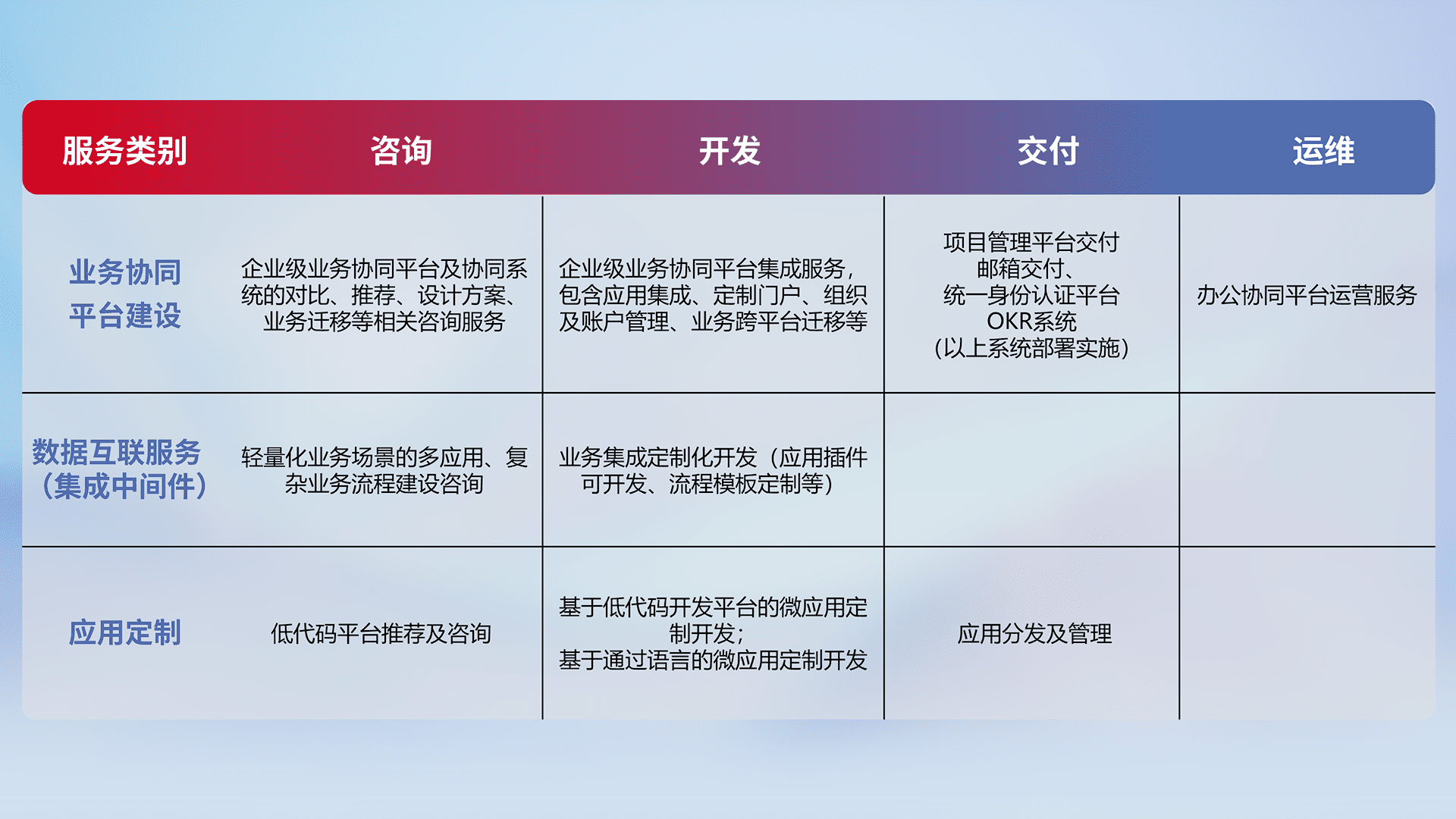 针对钉钉、、、、企微、、IDaas等平台级产品提供产品的规划、、、方案、、交付、、、定制化开发等服务,,,,实现如统一协同办公、、、智能客户服务、、、混合会议管理、、智能数据查询、、等业务场景,,实现数字化转型。。。