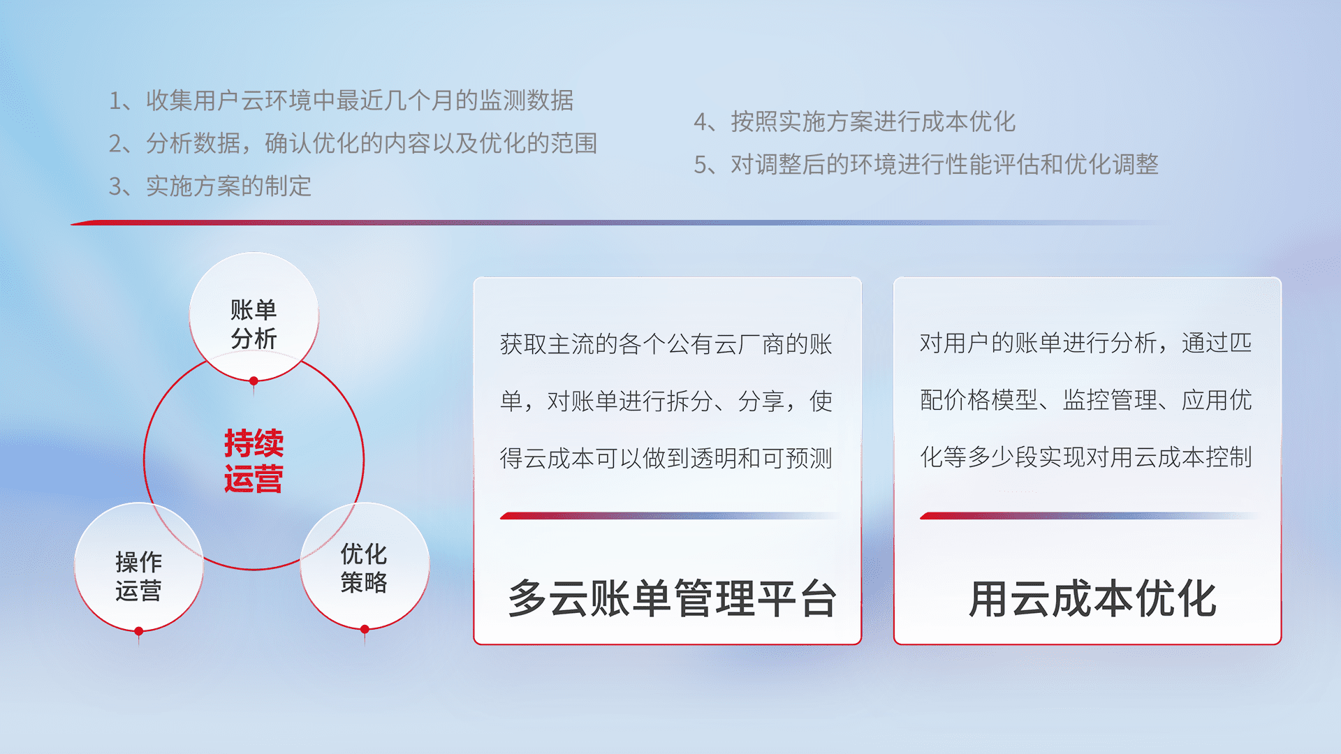 通过灵活运用多种自动化迁移工具,,,,帮助企业用户实现业务和数据高效 、、、稳定的上云迁移和云上迁移,,,,采用自研多云纳管平台,,,以中立管理模式,,,解决多组织、、、多云、、、多运维厂商的复杂关系的管理,,,保证多云平台资源配置的一致性,,,,实时掌控云资源运行数据,,运用智能化工具分析云资源多云平台的管理服务,,透明化管理成本支出,,,,用云成本可预测、、用云费用可优化、、、云资源配额有据可依。。